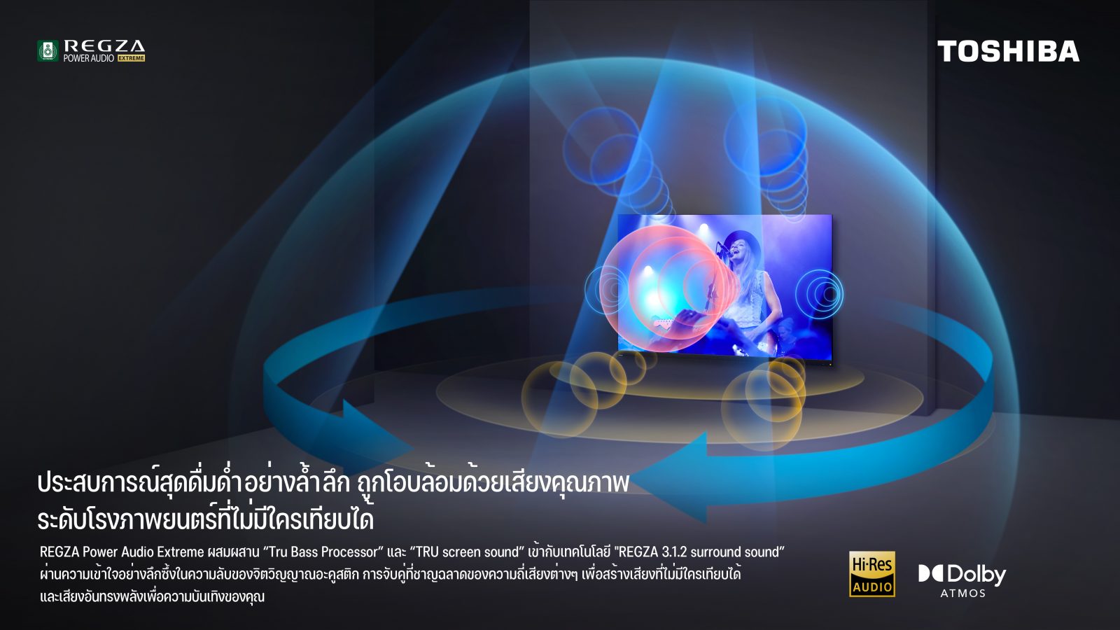 เพื่อให้ลูกค้าชาวไทยได้รับประสบการณ์ด้านภาพและเสียงที่ดีที่สุด โตชิบา ทีวี ทุ่มเทในการสร้างคุณภาพของภาพ และยังตั้งใจในการสร้างคุณภาพของเสียง ด้วยสุดยอดระบบเสียงของ REGZA ทีวี ซีรีย์ X9900L มาพร้อมกับลำโพงที่มีกำลังขับรวมสูงถึง 113 วัตต์ แบ่งเป็นลำโพง Sky Tweeter กำลังขับ 8 วัตต์ จำนวน 2 ตัว, Woofer กำลังขับ 25 วัตต์, Center Speaker กำลังขับ 12 วัตต์, Main Speaker ที่เป็น Full-range กำลังขับ 18 วัตต์ จำนวน 2 ตัว และที่เป็น Tweeter กำลังขับ 12 วัตต์ จำนวน 2 ตัว ทั้งนี้ โตชิบา ทีวี กล้าบอกได้อย่างภาคภูมิใจว่าลำโพงของทีวีที่มีกำลังขับอันทรงพลังนี้เราให้มามากกว่าผู้ผลิตรายอื่นๆ อย่างแน่นอน